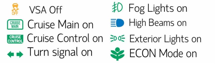 Los símbolos de encendido/apagado indican si cierta función de tu Honda está activa o no. Normalmente no requieren mantenimiento. A menos que nunca se apaguen, incluso cuando estás seguro de que una función en particular está inactiva, son simplemente recordatorios.
