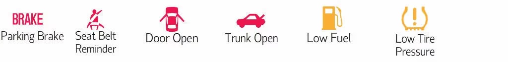 Los símbolos de condición representan situaciones menos graves, que te notifican sobre recordatorios básicos de cuidado del vehículo y seguridad de los pasajeros: combustible bajo, cinturones de seguridad sin abrochar, puerta abierta, maletero abierto, etc. Aunque algunos de estos símbolos pueden aparecer en rojo o ámbar, no es necesario agendar mantenimiento a menos que permanezcan encendidos de forma continua a pesar de haber solucionado el problema.